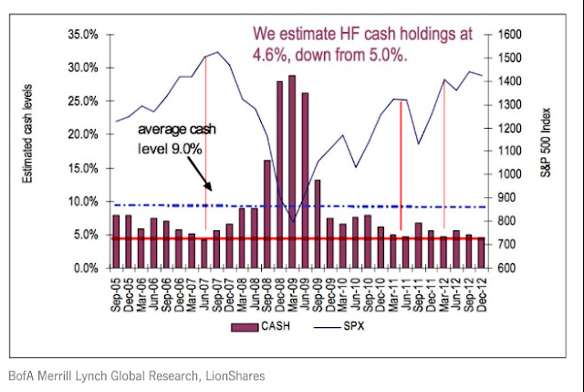 Hedge funds ended last quarter with nearly the lowest cash levels in 8 years. The vertical lines indicate how that has previously correlated with SPX. They too are likely feeling bullish.