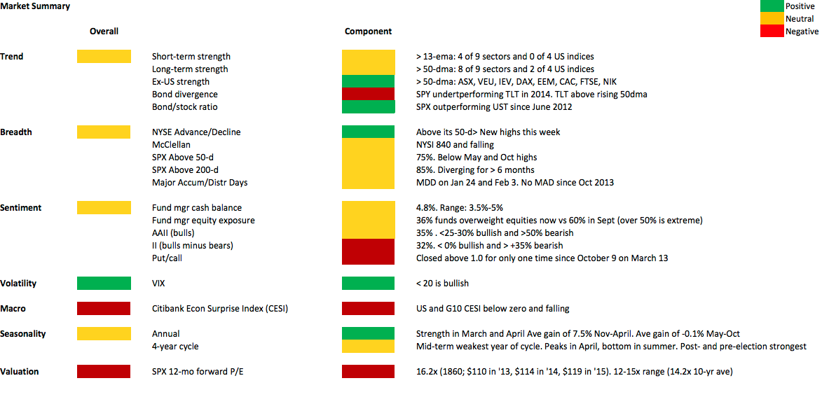 Earnings reports start this week. Per FactSet, SPX companies expect to report 1Q14 EPS growth of negative 1.2% on revenue growth of 2.3%. The negative earnings will almost certainly be exceeded to the upside. The key take away, however, is that profits, like the economy, are growing slowly. And if the estimates are accurate, SPX margins will fall (to 9.5%).