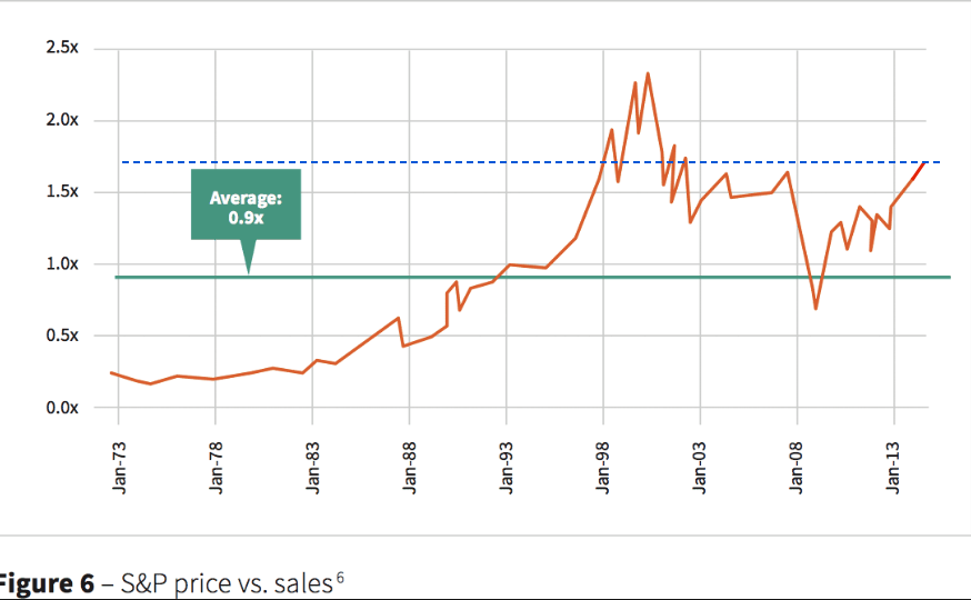 Third, no matter how you measure it, valuations are considerably higher now than in 1995-96. The chart below looks at price to sales on a trailing basis. The current level of 1.7x has only been exceeded by the tech bubble; in 1996, it was still only about 1.2x.