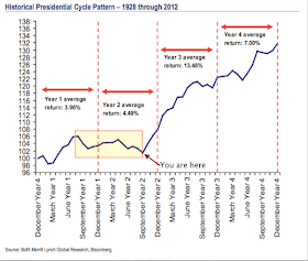 That is especially true during mid-term election years. These years usually meander until the 4th quarter, and then rally. Crucially, that continues into the third presidential year when stock returns are the greatest (chart from BAML).