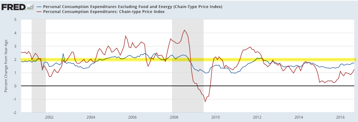The Fed prefers to use personal consumption expenditures (PCE) to measure inflation; total and core PCE were 1.2% and 1.7% yoy, respectively, last month. Neither has been above 2% since 2Q 2012.