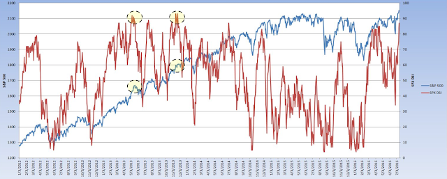 Similarly, the Daily Sentiment Index (DSI) exceeded 90 for the first time since late 2013 this past week. This is an exceedingly rare level of bullishness; similar readings over 90 in February 2011, May 2013 and November 2013 corresponded with drops in SPX of 7%, 8% and 3% in the ensuing weeks. Again, it took until May in 2013 before sentiment reached current levels (from Gavin Parks).