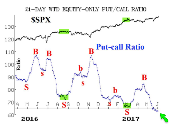 Last week, we reviewed a few reasons June could show seasonal weakness (read here). One of these became more acute this week: the one-month weighted average equity-only put/call ratio is now at it's lowest since December 2014: SPX fell 5% in the next month. Prior to that, this ratio reached current levels in mid-November 2013: SPX chopped sideways until the holidays, then rose 2% by early January before falling 6% later that month (green shading in the second chart; from Larry McMillan).