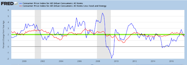 CPI (blue line) was 1.6% last month, a steep fall after being over 2% to start 2017. The more important core CPI (excluding volatile food and energy; red line) grew 1.7%, the lowest rate in 2 years (since February 2015), although still just oscillating near 2%.
