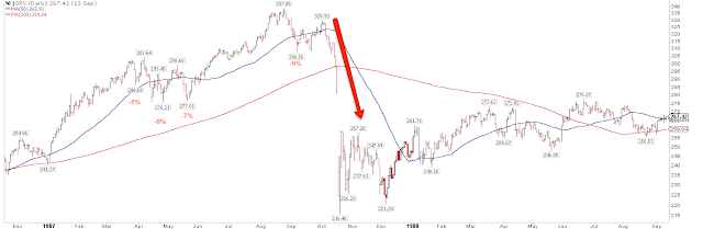 In 1980 and in 1986, SPX fell 9% within 2 weeks. In 1980, the high was retested in less than a month (and then equities fell into a bear market). In 1986, SPX double bottomed in the next 2 weeks and was at the prior high after about 2 months (from Quantifiable Edges).