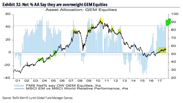As the region outperformed in 2016, allocations rose to +31% overweight in October 2016, the highest in 3-1/2 years. That made the region a contrarian short: emerging equities then dropped 10% in the next two months.