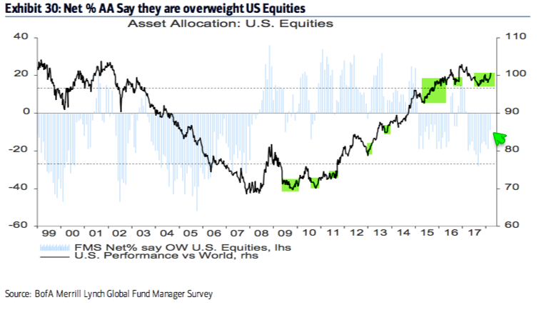 In September 2017, investors again became bearish US equities, giving them the lowest allocation in 10 years. This largely remained the case through February 2018. US equities outperformed.