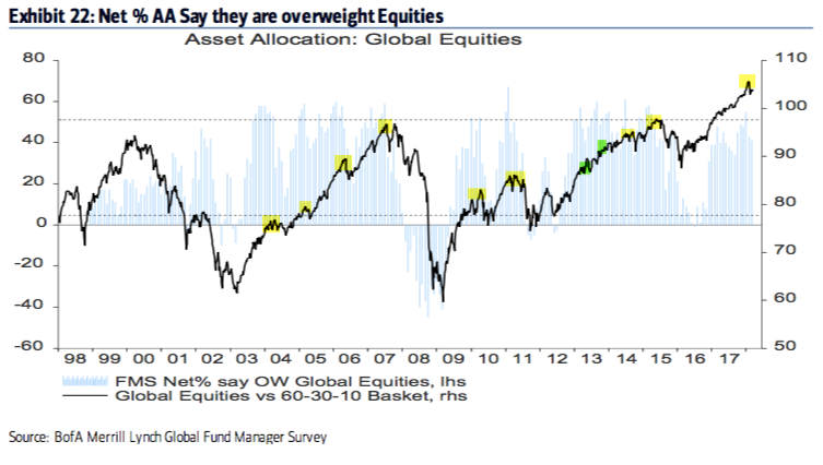 Summary: Fund managers came into 2018 very bullish equities. Cash levels had fallen to the lowest level in 4 years. Allocations to global equities had risen to the highest level in nearly 3 years. Bond allocations were at a 4 year low. Our view at the time was that "this is a headwind to further gains" in equities. That post is here.