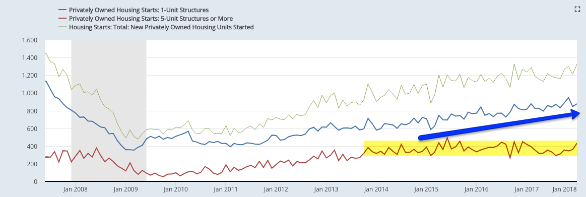 Second, housing starts rose 7% yoy in January after rising 10% yoy in January 2017. Starts in January were at the second highest level of the past 10 years.