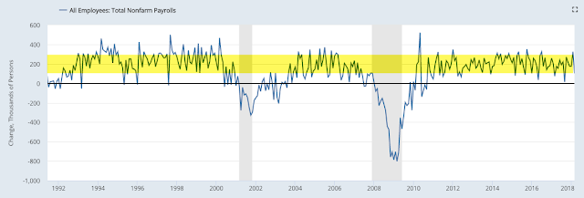 Monthly NFP prints are volatile. Since the 1990s, NFP prints near 300,000 have been followed by ones near or under 100,000. That has been a pattern during every bull market; NFP was negative in 1993, 1995, 1996 and 1997. The low print of 103,000 this month, 73,000 in March 2017 and 14,000 in September 2017 fit the historical pattern. This is normal, not unusual or unexpected.