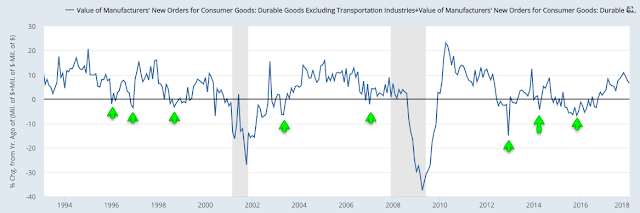 Core durable goods orders (excluding military, so that it measures consumption, and transportation, which is highly volatile) rose 6.6% yoy (nominal) in February, close to the best annual growth rate in 4 years (since December 2013). Weakness in durable goods has not been a useful predictor of broader economic weakness in the past (arrows).