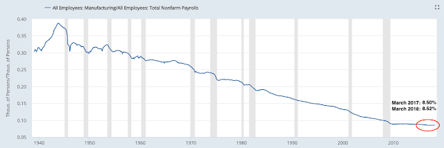 The next several slides look at manufacturing. It's important to note that manufacturing accounts for less than 10% of US employment, so these measures are of lesser importance.