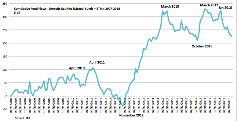 Given the strength in earnings, macro and equities, it would be unsurprising if investor sentiment was overly bullish, yet the evidence suggests it's not. Fund flows into domestic equity mutual funds and ETFs has been strongly negative in recent months. $30b has flowed out of those funds in the past 10 weeks and $100 has flowed out since the end of January and the prior peak in SPX (from ICI).