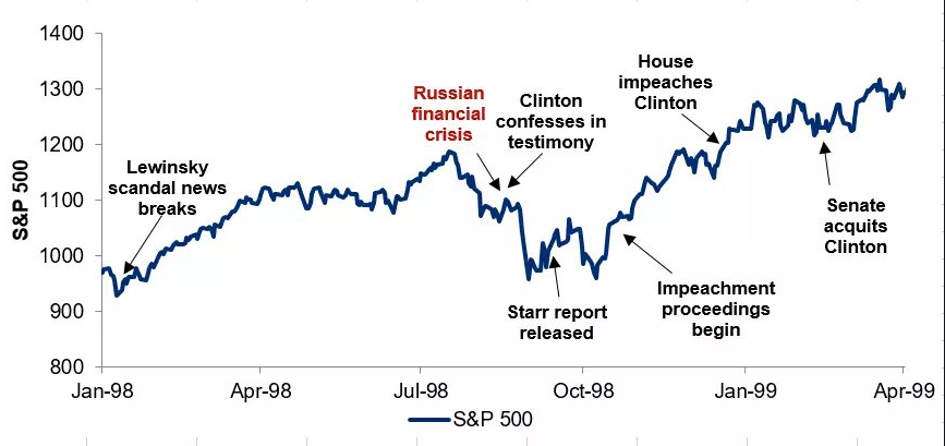 Politics are also an unlikely source of sustained market risk. The Clinton impeachment in 1998 provides an example: the SPX mostly rose throughout and ended the year more than 20% higher (from Barry Ritholtz).
