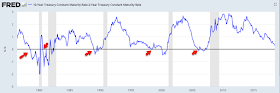 For now, the bond market sees continued growth. The yield curve has 'inverted' (10 year yields less than 2-year yields) ahead of every recession in the past 40 years (arrows). The lag between inversion and the start of the next recession has been long: at least 8 months and in several instances as long as 2-3 years. On this basis, the current expansion will likely last into mid-2019 at a minimum. Enlarge any image by clicking on it.