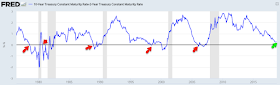 The bond market agrees with the macro data. The yield curve has 'inverted' (10 year yields less than 2-year yields) ahead of every recession in the past 40 years (arrows). The lag between inversion and the start of the next recession has been long: at least a year and in several instances as long as 2-3 years. On this basis, the current expansion will likely last through 2018 at a minimum. Enlarge any image by clicking on it.