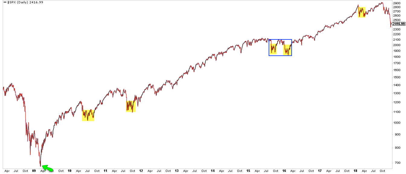 (For better or worse, "bear markets" are most commonly defined as a high to low drop of more than 20% in SPX on a closing basis. Is it arbitrary? Yes. So is a cut-off of 15%, 19% or 25%. Thus, 1998 and 2011 don't strictly qualify. We don't make the rules).