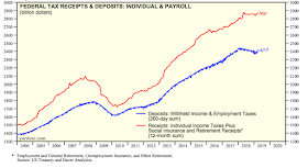 For those who doubt the accuracy of the BLS employment data, federal individual income tax receipts have also been rising to new highs (red line), a sign of better employment and wages (from Yardeni).