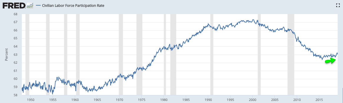 The labor force participation rate (the percentage of the population over 16 that is either working or looking for work) has stabilized over the past 5 years. The participation rate had been falling since 2001 as baby boomers retire, exactly as participation started to rise in the mid-1960s as this demographic group entered the workforce. Another driver is women, whose participation rate increased from about 30% in the 1950s to a peak of 60% in 1999, and younger adults staying in school (and thus out of the work force) longer.