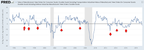 Core durable goods orders (excluding military, so that it measures consumption, and transportation, which is highly volatile) fell 2.6% yoy (nominal) in April. Weakness in durable goods has not been a useful predictor of broader economic weakness in the past (arrows).