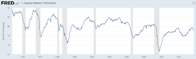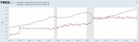 A better measure is the prime working age (25 to 54 year olds) labor force participation rate; it stands at 82%, down only slightly from its peak in 2000 at 84%, and much higher than anytime prior to the 1980s.