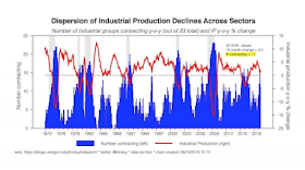 Importantly, 52% of industrial production groups are expanding. A drop below 40% has implied widespread weakness that typically precedes a recession (from Tim Duy).
