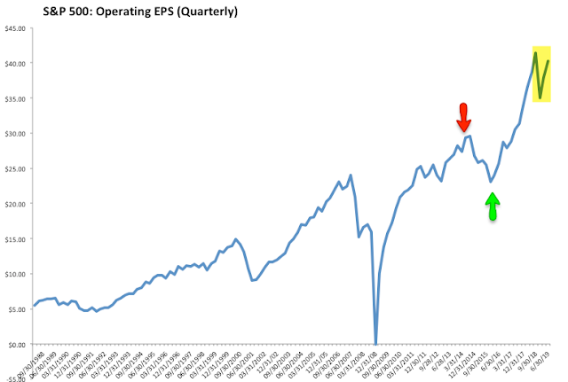 The arrows in the next chart again indicate the period when oil prices fell 70% between 2014 and 2016. The improvement in total EPS since then comes with energy sector EPS at one-third of its level in mid-2014, but note how energy EPS has been nearly halved in the past 9 months.