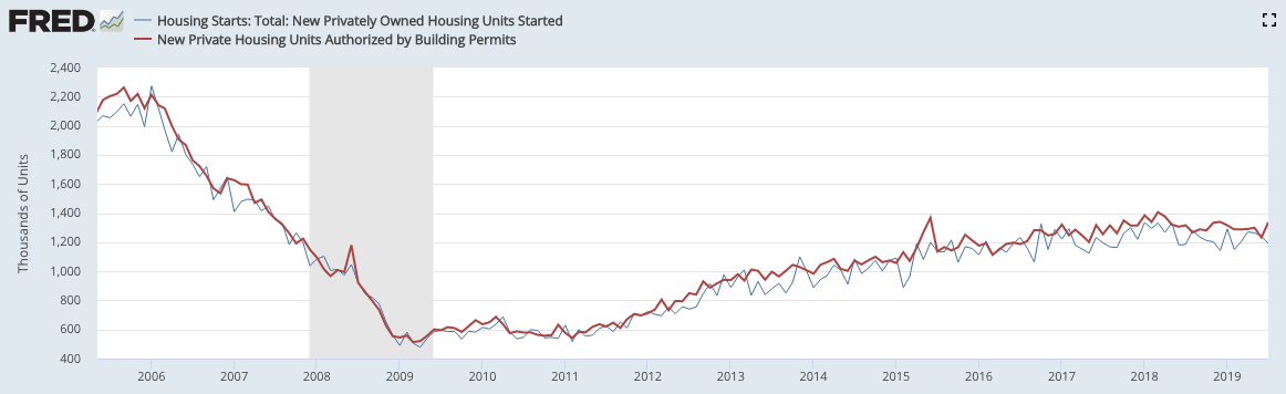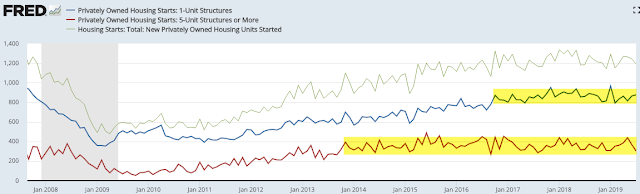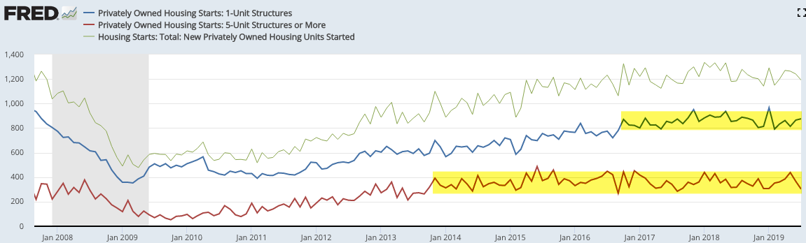 Single family housing starts (blue line) rose 2% yoy in July; multi-unit housing starts (red line) fell 5% yoy and have been a drag on overall starts for more than 5 years.