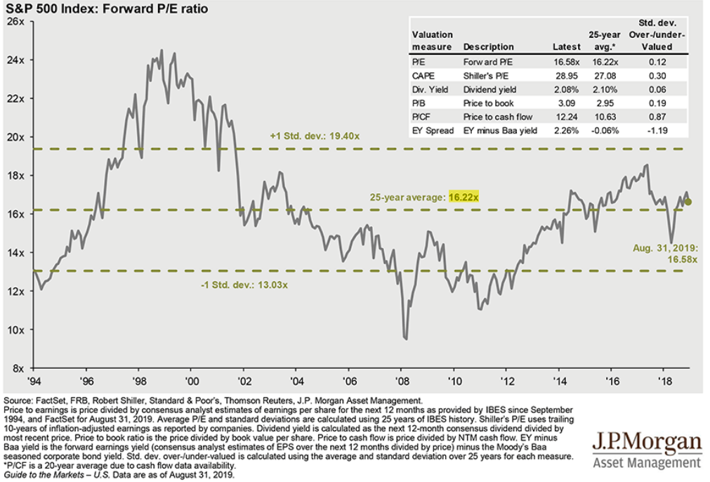 Valuations are slightly above their 25 year average. The consensus expects earnings to only grow about 3% in 2019 but there is room for faster equity appreciation through valuation expansion (chart from JPM).