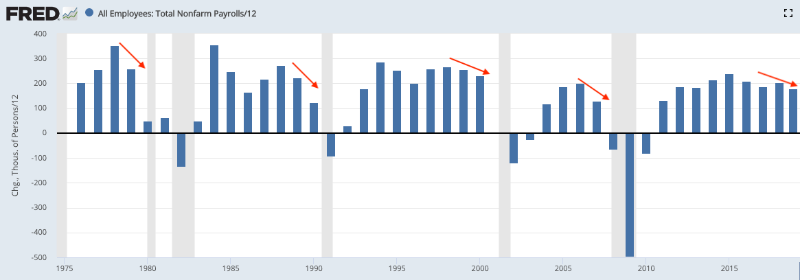 Employment growth is decelerating this year. The average monthly gain in employment was 240,000 in 2015, 211,000 in 2016, 189,000 in 2017 and 204,000 in 2018. In the past 12 months, the monthly average has fallen to 173,000, the lowest in 7 years.