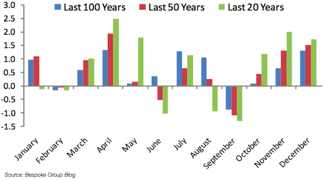 While October has a reputation as being the worst month of the year for stocks, this hasn't been the case. Over the past 20, 50 and 100 years, returns have been positive in October. Perhaps more importantly, the November to January period is the strongest 3 month stretch of the year, something to bear in mind should equities weaken further during October (data from Bespoke).