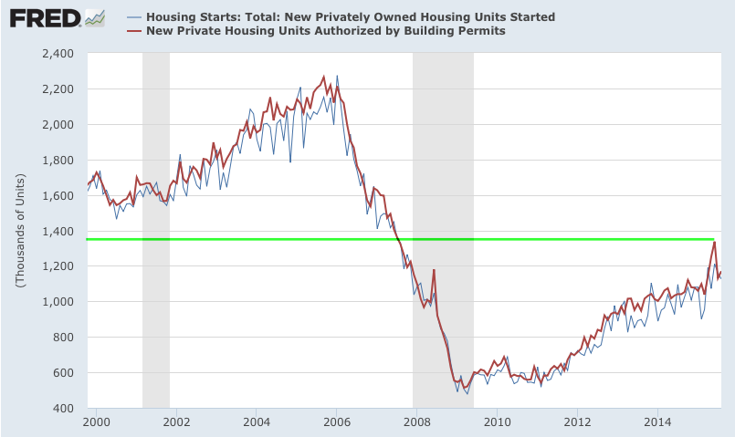For this reason, it's better to look at the trend; in September, trend growth was 2.0% yoy. Annual growth continues to be close to the highest since the 1990s. Employment growth in 2015 has been better than at any time during the 2003-07 bull market.
