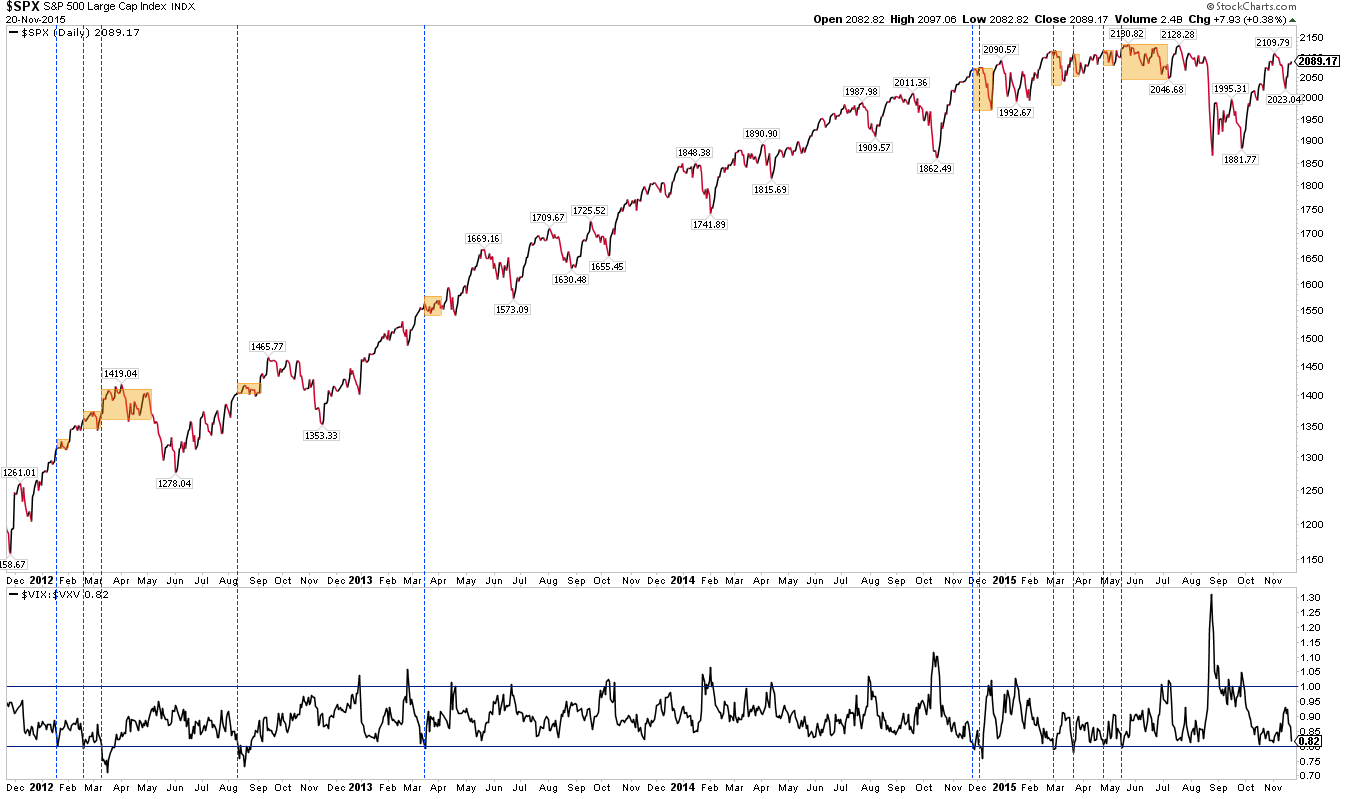 Volatility has been falling. It has a natural tendency to fall on Fridays. On further weakness, we will be watching the term structure; the stock market has a propensity to give back its gains when VIX:VXV falls below 0.8 (lower panel).