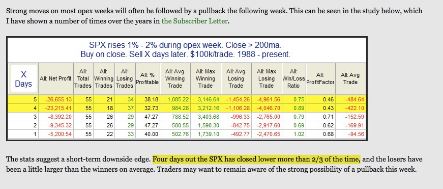 One reason that drop may come sooner rather than later is this: when SPX is up more than 1-2% during an OpEx week (as it was this week), then the following week is down more than 60% of the time (data from Rob Hanna; his post here).