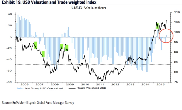 Many commodities have a tendency to move opposite the dollar. The dollar has been very strong the past 5 years, during which time commodities have fallen. Might the dollar reverse lower? It's possible. The dollar has historically weakened after the Fed has started to raise rates, contrary to what is commonly believed (are on that here). Moreover, fund managers views on the dollar have been prescient in the past; they viewed the dollar as overvalued in March and the currency fell 7% in the next two months. They again see the dollar as overvalued (data from BAML).