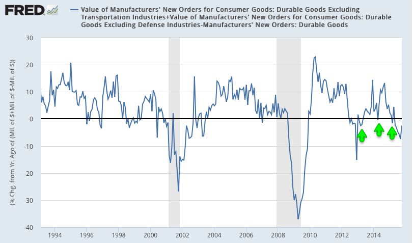 Core durable goods orders (excluding military, so that it measures consumption, and transportation, which is highly volatile) fell 2% yoy (nominal) in October. It grew 6% a year ago, so the yoy comparable is unfavorable. During the heart of the prior bull market, growth was typically 7-13%. Weak growth in winter has been a pattern the past three years (arrows), but it has not bounced back this year.