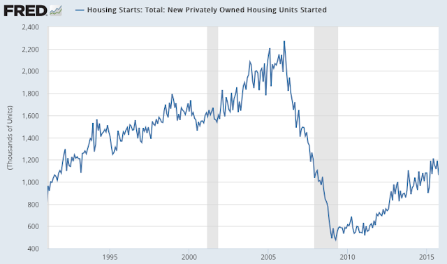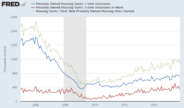 Second, overall starts in October dropped to a 6-month low; last month was near a new 8 year high, which indicates how volatile the monthly data can be. The annual growth rate was -2% yoy. The overall level of construction is well off those during the prior two bull markets, but the trend is clearly positive.