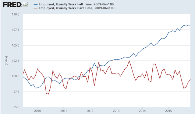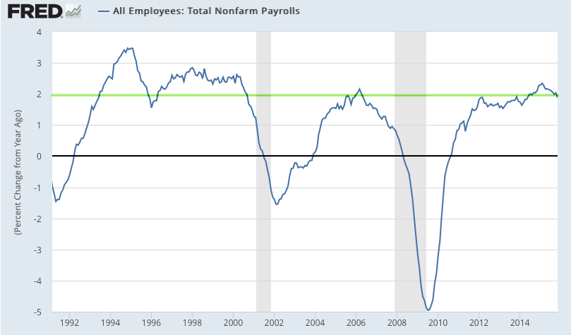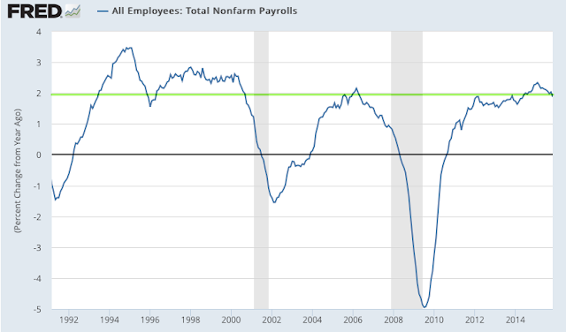 For this reason, it's better to look at the trend; in November, trend growth was 1.9% yoy. Annual growth continues to be close to the highest since the 1990s. Employment growth in 2015 has been better than at any time during the 2003-07 bull market.