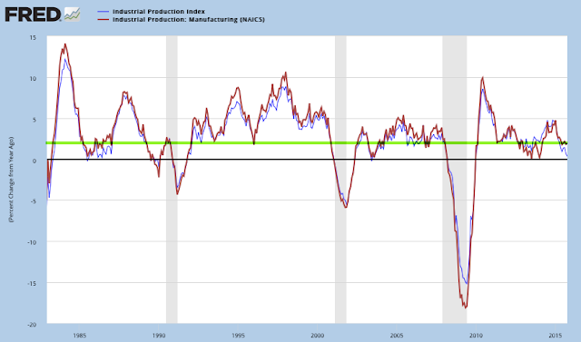 Industrial production growth was 0.3% in October. The more important manufacturing component (excluding mining and oil/gas extraction; red line) grew 1.9%. The current growth is at the low end of the past 15 years' range (1.5-5%). It's a volatile series; manufacturing growth was lower at points in both 2013 and 2014 before rebounding strongly.