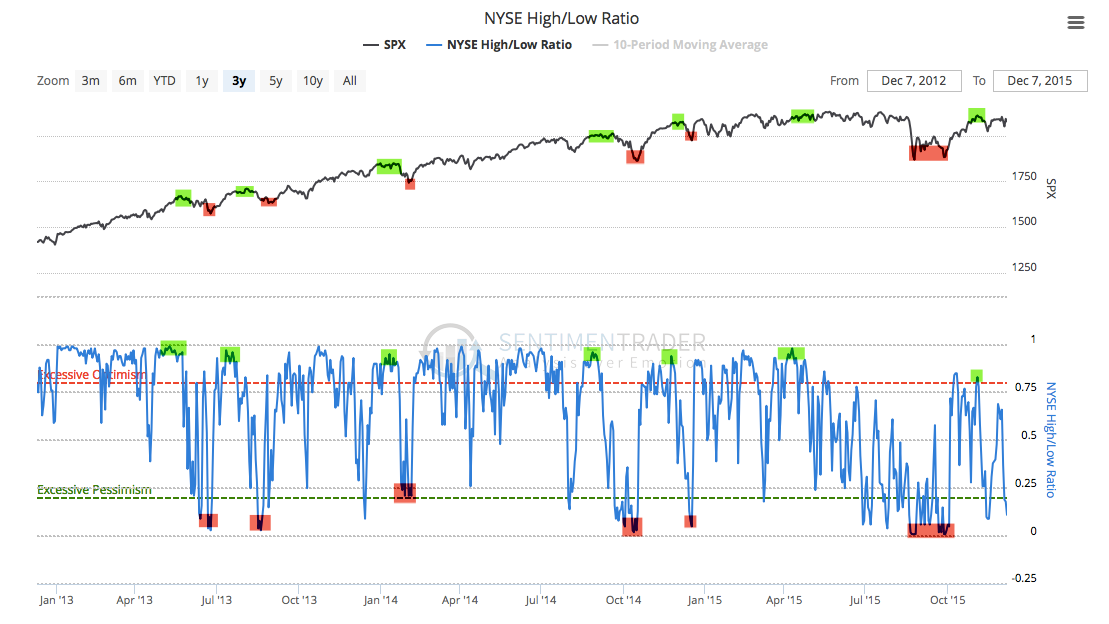 The discussion has now turned to weakness in new 52-week highs versus new 52-week lows (known as the high-low ratio). It is weak, but as the chart below shows, index lows correspond to lows in the high-low ratio (red shading) and market peaks correspond to highs in the high-low ratio (green). This is exactly opposite to what many market commentators imply, but it fits the same breadth pattern that we see in A-D. This is a different way of thinking about breadth which we find has value (data from Sentimentrader).