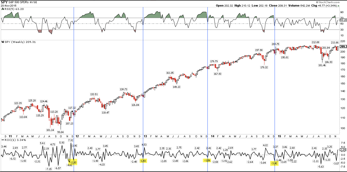 Our view coming into December was that a swoon was high odds and would provide an attractive entry point for a year-end rally (read the post here). As we said then: There have been drops of 2-4% each year in December the last 4 years. All of the drops put SPX below the close from the week prior to Thanksgiving. This week's drop did as well. Our chart is reproduced below.