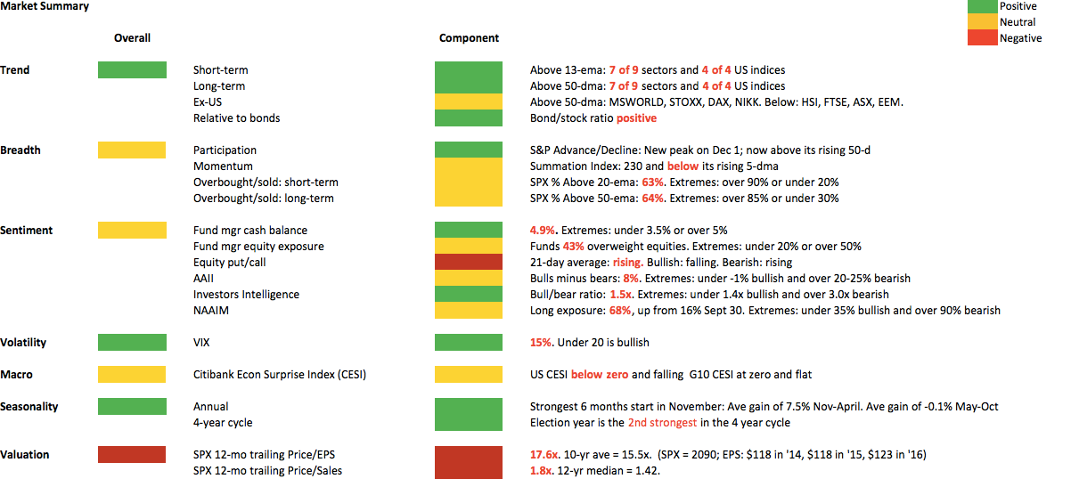 So trend and macro support higher prices while breadth and sentiment are at worst neutral. On balance, equities should have further gains into year-end. That is our bias.