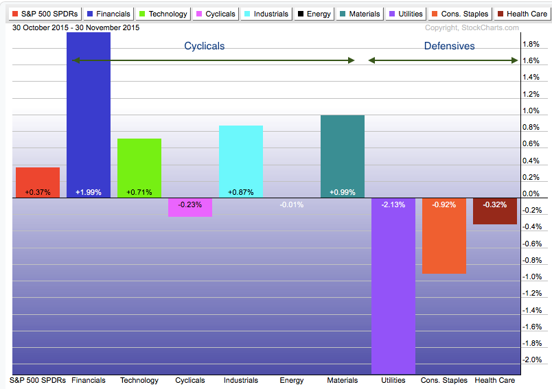 The month of November, which was flat for the indices, was supported by outperformance from pro-growth cyclical sectors. Cyclical leadership is a positive characteristic in uptrending markets. That the indices didn't move higher is mostly attributable to lagging defensives, especially utilities.