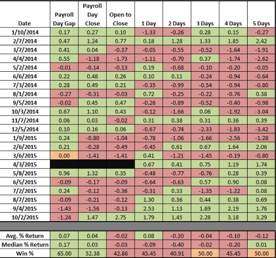 The week after the release of NFP data has tendency to give back some gains. In the past 2 years, 75% have seen at least one lower close (November closed lower, not included in table; data from Chad Gassaway).