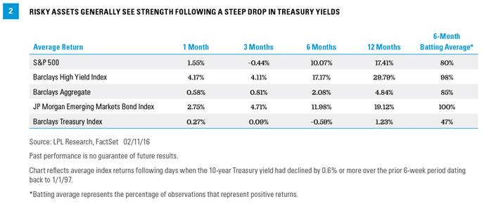The recent drop in equities is very similar to those instances shown above when treasury yields dramatically fell. How did equities perform subsequently? On average, equities rose in the following month and were 10% higher 6-months later