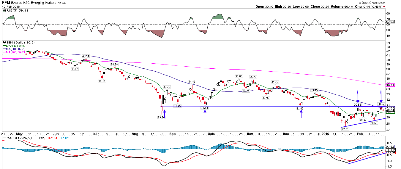 Outside the US, emerging markets gained more than 3% this week. EEM is forming an ascending triangle; a close above 31 opens upside to 33-35.