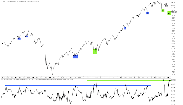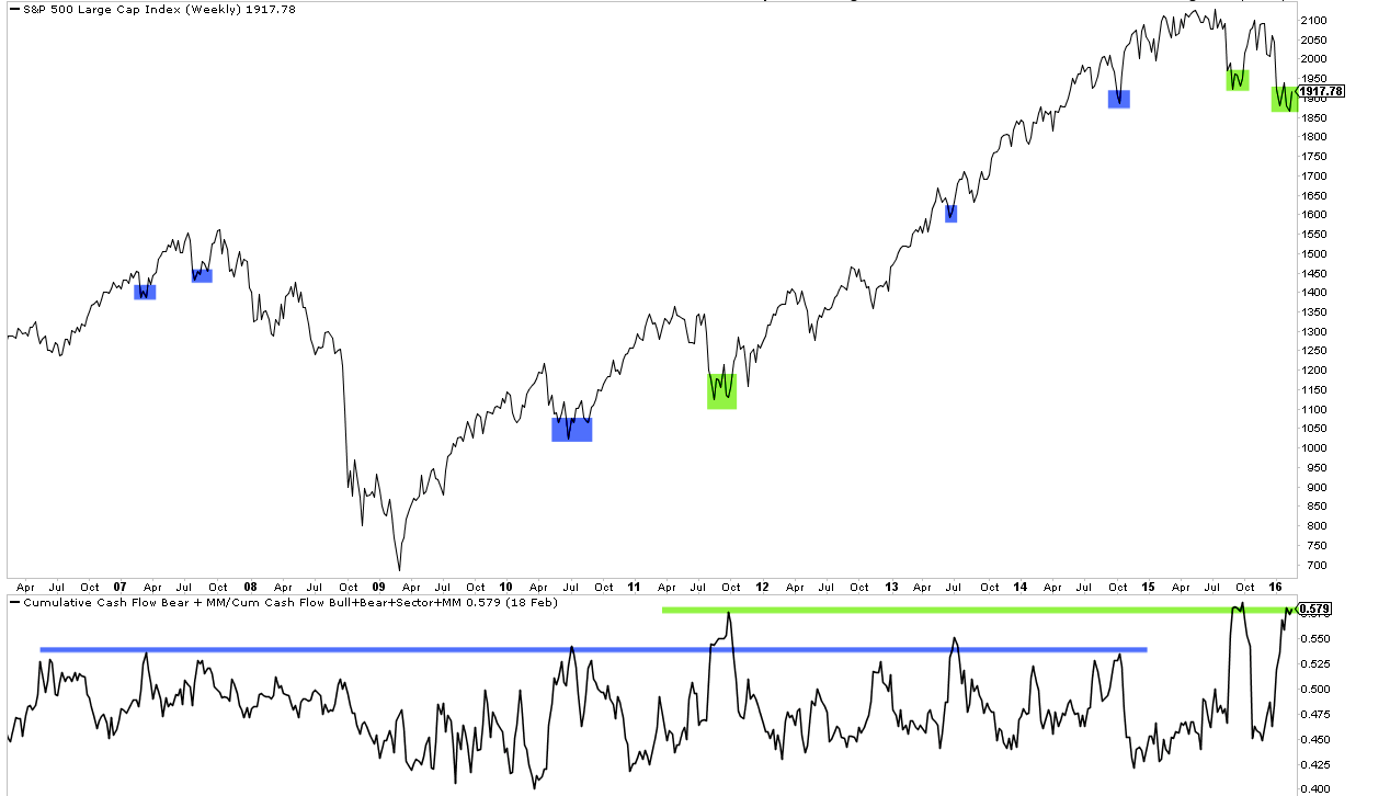 Investors' risk aversion is also reflected in fund flows. $5.7b left equity funds this week, making fund lows negative 11 of the past 12 weeks. Meanwhile, flows into bonds have been positive 9 weeks in a row. That dynamic can be seen in the Rydex funds: shown below is bear assets plus cash relative to all fund assets. Prior spikes in risk-aversion correspond to near lows in equities.