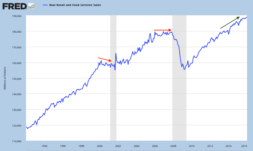 Macro data continues to suggest that a recession is unlikely. That's important, as bear markets rarely take place outside of an economic recession (a post on this is here). This week, retail sales reached a new all-time high. The trend is higher, in comparison to the period leading into the prior two recessions (arrows).