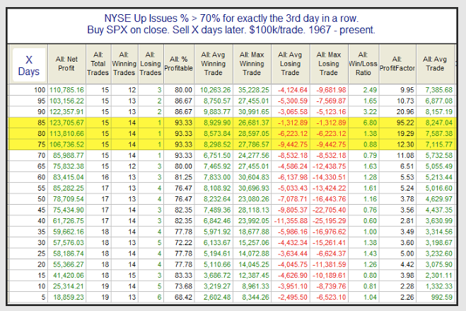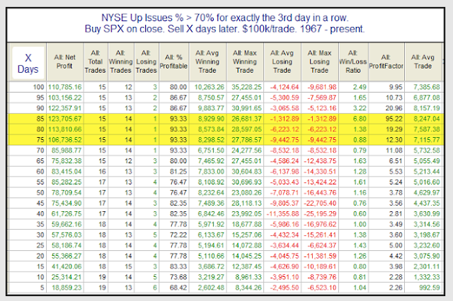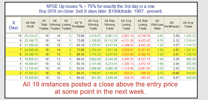 Importantly, the rise in equities this week came on strong breadth. More than 70% of the issues on the NYSE advanced for three days in a row. In the past 19 times this has occurred, SPX has closed higher than on Day 3 within one week every time (first table). This implies a close above 192.9 in the week ahead. Moreover, SPX was higher 3 weeks later over 80% of the time (second table). A post on this by Rob Hanna is here.