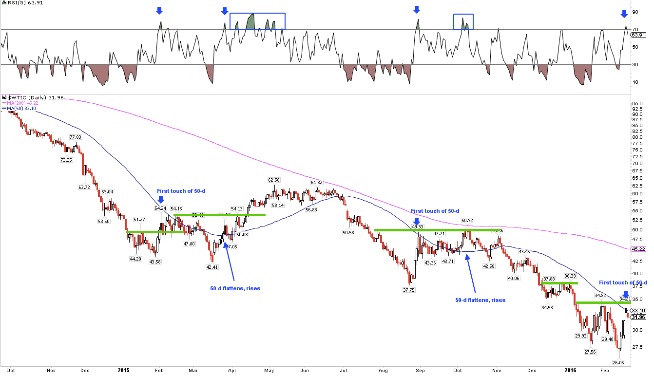 We reviewed a typical bottoming pattern for oil last week (here). With a big gain this week, oil made it's first touch of the 50-d since early November. Over $35, and it will have exceeded the first pivot (green line). It barely became overbought (top panel) for the first time in 5 months. These are all positives. Look for oil to consolidate near the 50-d (which flattens/rises), push through the pivot and stay overbought as further signs that the trend may have changed.